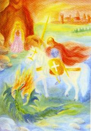 Op de plaats waar ze de draak verwachtte ging ze staan, aan de oever van het meer waaruit hij te voorschijn zou komen. Terwijl ze daar stond en de mensen op de stadmuur met angst de komst van de draak afwachtten, kwam over het veld ridder Joris aanrijden. Hij reed op een wit paard en zijn harnas blonk in het licht. Hij reed op haar toe en vroeg waarom ze daar stond. "Heer", ze ze, "vraag daar niet naar, maar bestijg je paard en vlucht, opdat je niet ook je leven verliest."