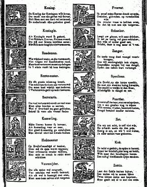 Op deze wijze kunnen de drie koningen door het lot worden gekozen. De koningskoek bakken we nog steeds en de kinderen verheugen zich op deze avond. Wie zal de boon in zijn stuk koek vinden? Wie de ring? Wie de munt? Wie zal deze avond de zwarte koning zijn en welk spel zal hij kiezen? Verstoppen? Pandverbeuren? Charades? Koekvergulden? De kronen liggen al klaar...