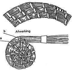b. de wikkelingen worden aan de binnenkant aangetrokken. Stro wordt van rechts bijgestoken.